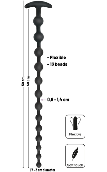 Beskrivning: Extra långa och flexibla analpärlor från Black Velvets som är designade för att ge maximal stimulans och komfort. Med sina 50 cm och 13 sammetsmjuka pärlor erbjuder de en unik möjlighet att gradvis utforska djupare sensationer. Pärlorna börjar med en liten diameter på 1,7 cm och ökar successivt till 3 cm, vilket gör det enkelt att anpassa upplevelsen efter dina önskemål.