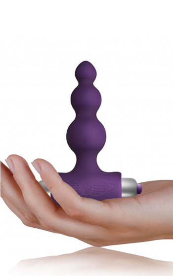 Beskrivning: Vibrerande analkulor av följsamt lila silikon och en löstagbar vibrator som även kan användas separat till exempelvis klitoris. De tre kulorna ökar i storlek från liten till medelstor vilket gör Bubbles perfekt även för den rumpnyfikna nybörjaren. Produkten är vattentät och kan utan problem dränkas helt i vatten så länge batterilocket är åtdraget. Vibratorn är extremt tyst och levereras med batteri för omedelbara lekar så snart du hämtat ut ditt paket. Välj och växla mellan 7 lägen på motorn via en och samma knapp i botten. Produkten har en penetrerande längd på 9 cm. Applicera gärna en klick glidmedel på toppen för enklare införande.