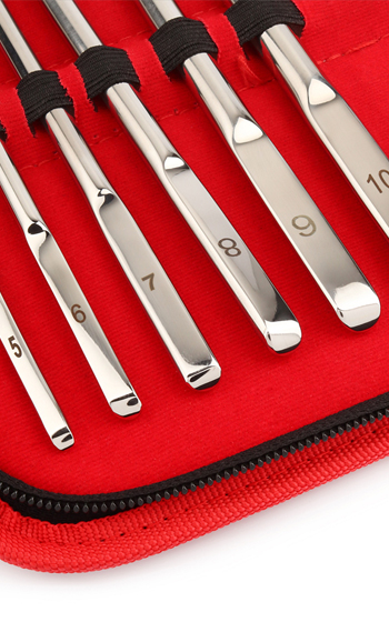 Beskrivning: Utforska urethral stimulering med Mr. Steel Single End Urethral Dilators, ett set med 10 individuellt numrerade stavar för gradvis och kontrollerad utvidgning. Tillverkade av rostfritt stål med en slät, polerad yta, erbjuder dessa dilatorer en smidig upplevelse och exakt hantering.